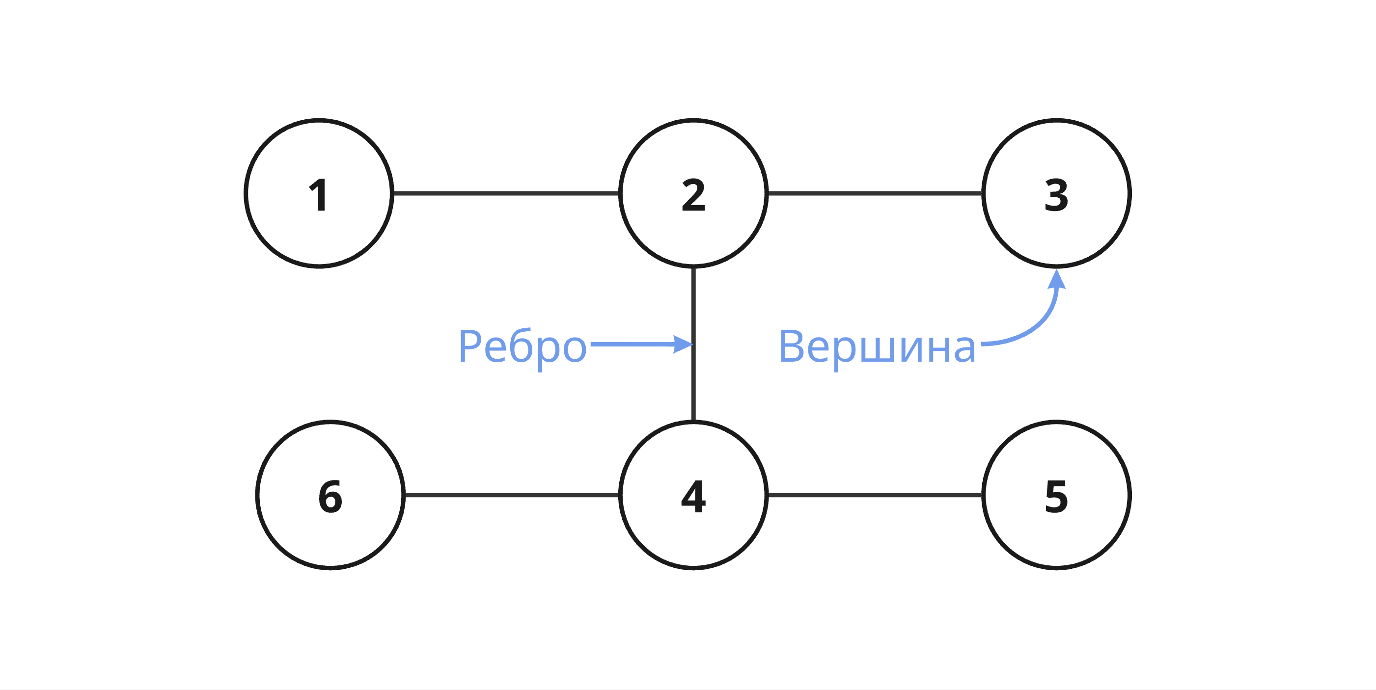 Граф — набор элементов и связей между ними. Набор элементов называют вершинами, а связи между элементами — ребрами. В простом виде выглядит так: