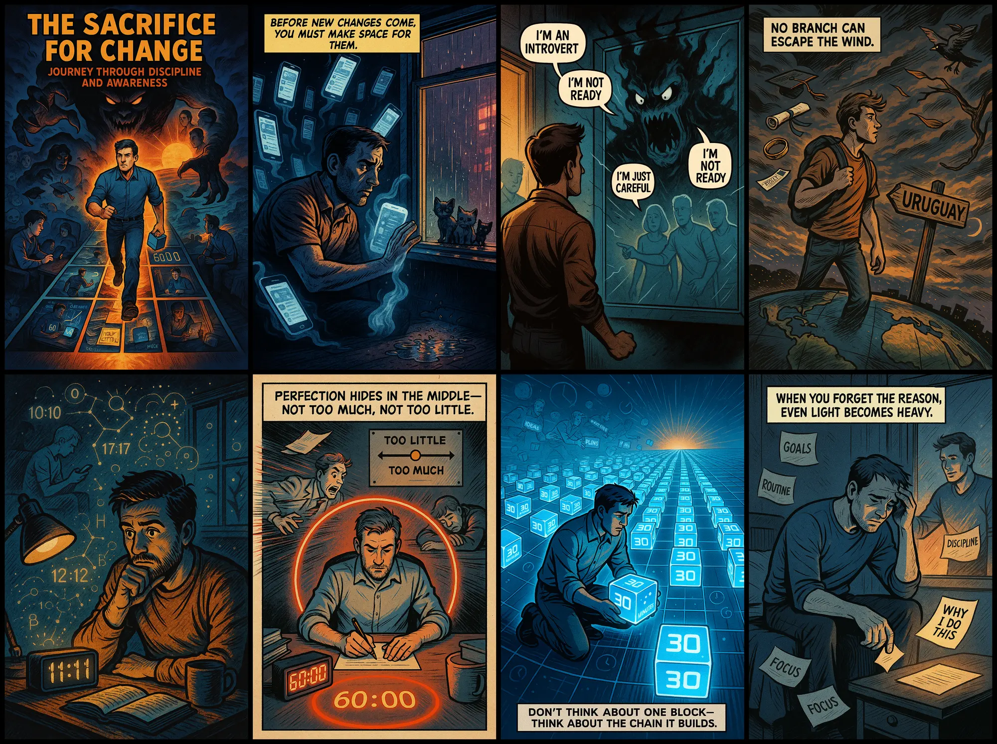👻 Сначала что-то убрать. Часто хочется найти некую волшебную таблетку, после которой придут долгожданные перемены. Но есть ли место для этих перемен? Ведь каждая минута занята и придется принести жертву. Жертва будет против — например, перестал скролить ленты социальных сетей и освободил три часа в день, но ленты просились обратно как маленькие котята на улице под дождем. Котята — маленькие, безобидные, всего на 5 минут и одним глазком. Но это котята дикого зверя, поглощающего время. После жертвы появится пустое место, которое будет хотеться заполнить — окно для перемен и осмысленного внедрения нового. Задача поменяется на противоположную — новая привычка будет постоянно пытаться удрать, но это для другого выпуска. Перед решением заняться завтра тем, что откладывал 10 лет, нужно принести в жертву сегодня то, чем занимался последние 10 лет.